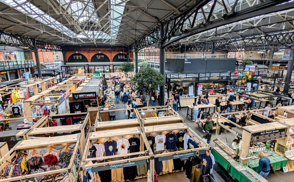 13:30 Uhr: Der Markt ist wirklich super. Sehr viele kleine Stände mit selbstgemachten Produkten. Einen schicken Essensbereich gibt es hier auch mittig. Auf dem Weg hierhin haben wir noch eine Kette entdeckt, bei der es frisch gemachte Sandwiches gibt. Die haben wir uns zur Stärkung rein gepfiffen. Was aber wirklich gerade nervt, ist das miserable Internet von O2 hier in London. Ich werde mir deswegen noch eine eSim organisieren.