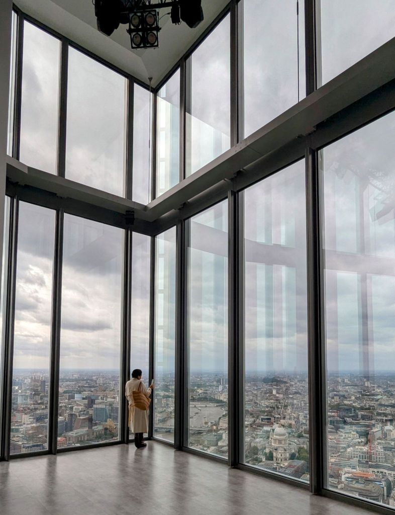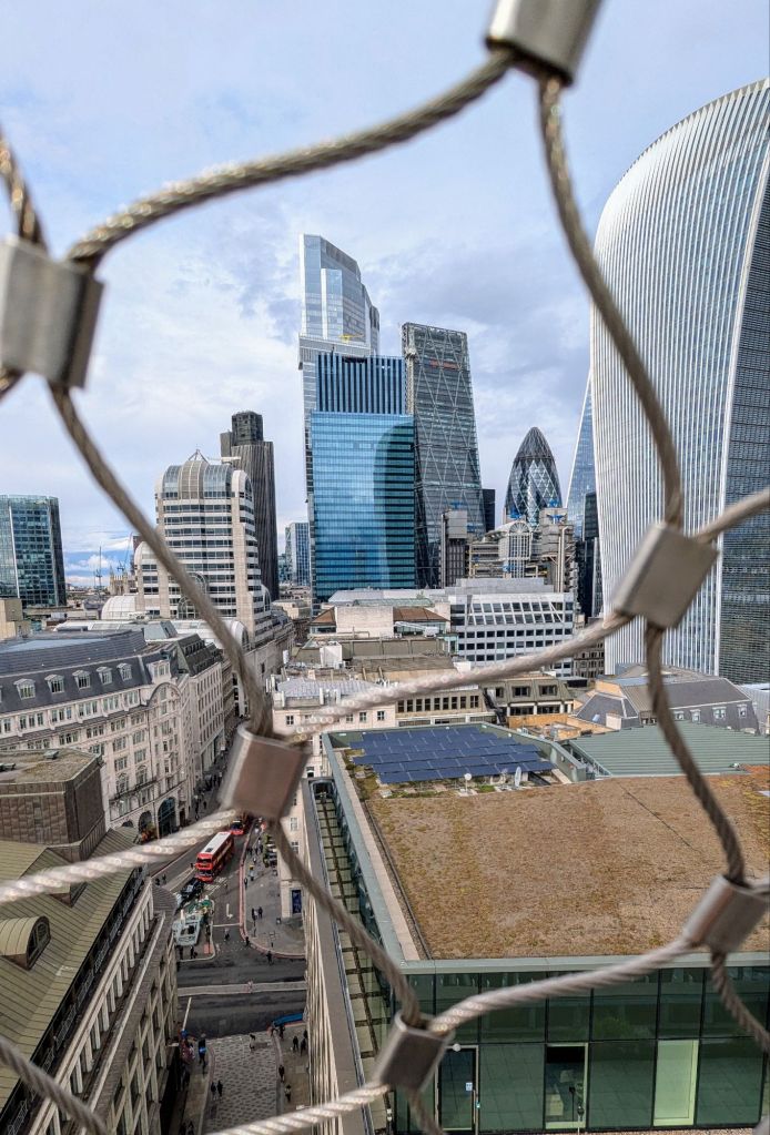 Unser nächstes Ziel ist das Tate Modern Blavatnik Building. Hier soll es eine kostenfreie Aussicht vom Café in der obersten Etage geben. Wir laufen im Zickzack durch die Straßen und erkunden damit auch die etwas ruhigeren Gegenden. Oh, wir sind schon da. Schnell mit dem Fahrstuhl nach oben. Ach verdammt, die Plattform ist heute geschlossen und wir können somit nur vom Cafe aus die Aussicht fotografieren. Schade.