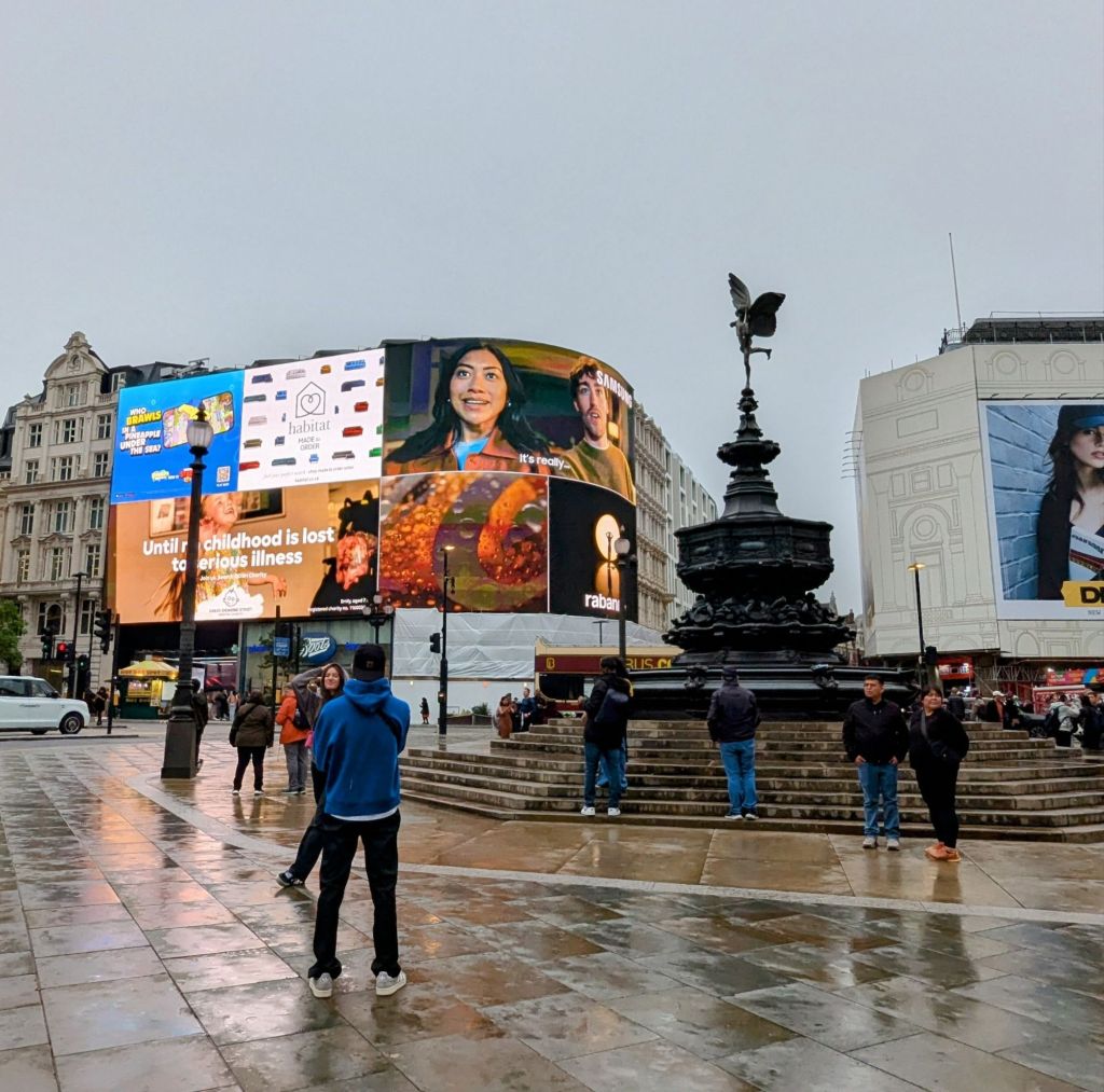 Es ist kurz nach 17 Uhr und wir haben aufgrund des Wetters keine wirkliche Lust mehr noch irgendetwas zu machen. Ich habe deswegen beschlossen, zurück ins Hotel zu laufen. Die Strecke, rund 5 km, ist angeben mit einer Stunde. Noch fix ein Foto vom Shaftesbury Memorial Fountain mit den gigantischen digitalen Reklametafeln im Hintergrund schießen. Dann geht es los.