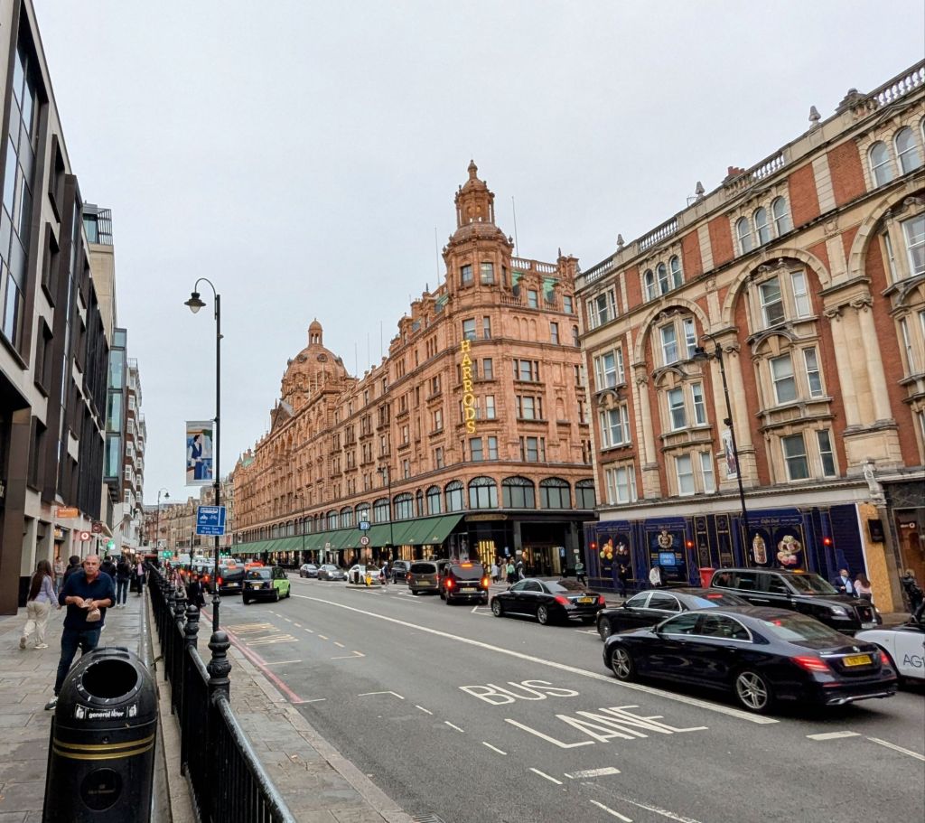 Ich bin gerade am Harrods, eines der ältesten Luxuskaufhäuser der Welt, angekommen. Ich werfe mal einen kurzen Blick hinein. Sieht alles sehr verwinkelt hier aus und die typischen offenen weiten Flächen, wie in modernen Kaufhäusern, fehlen hier komplett. Aber ist somit abgehakt 😂.