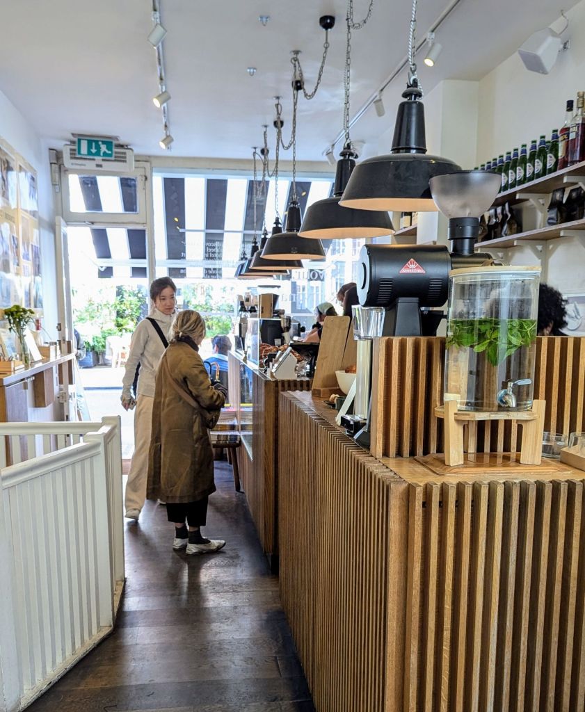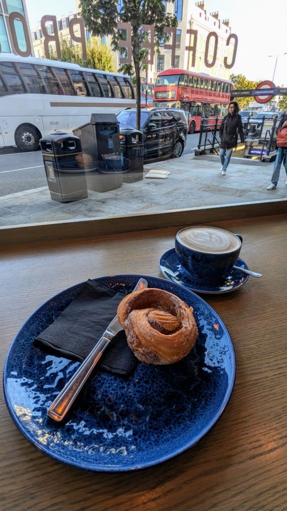 09:00 Uhr: Wir starten heute unsere Tour in einem Café bei Notting Hill. Ich habe dazu ein passendes herausgesucht, mit dem Namen Cafe Project Notting Hill project. Sehr lecker, hier gibt es wieder Zimtrollen. Dann kann der Tag ja gut starten.