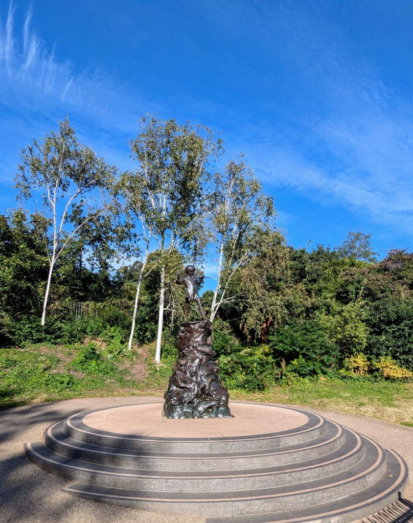 Ich habe gesehen, dass es hier sogar eine Peter-Pan-Figur geben soll. Diese steuere ich als Nächstes an. Sehr witzig, neben der Figur gibt es einen QR-Code. Wenn man diesen scannt, kann man sich mit Peter Pan unterhalten. Ich überlege, was heute im Zeitalter von KI alles an Dialogen möglich wäre.