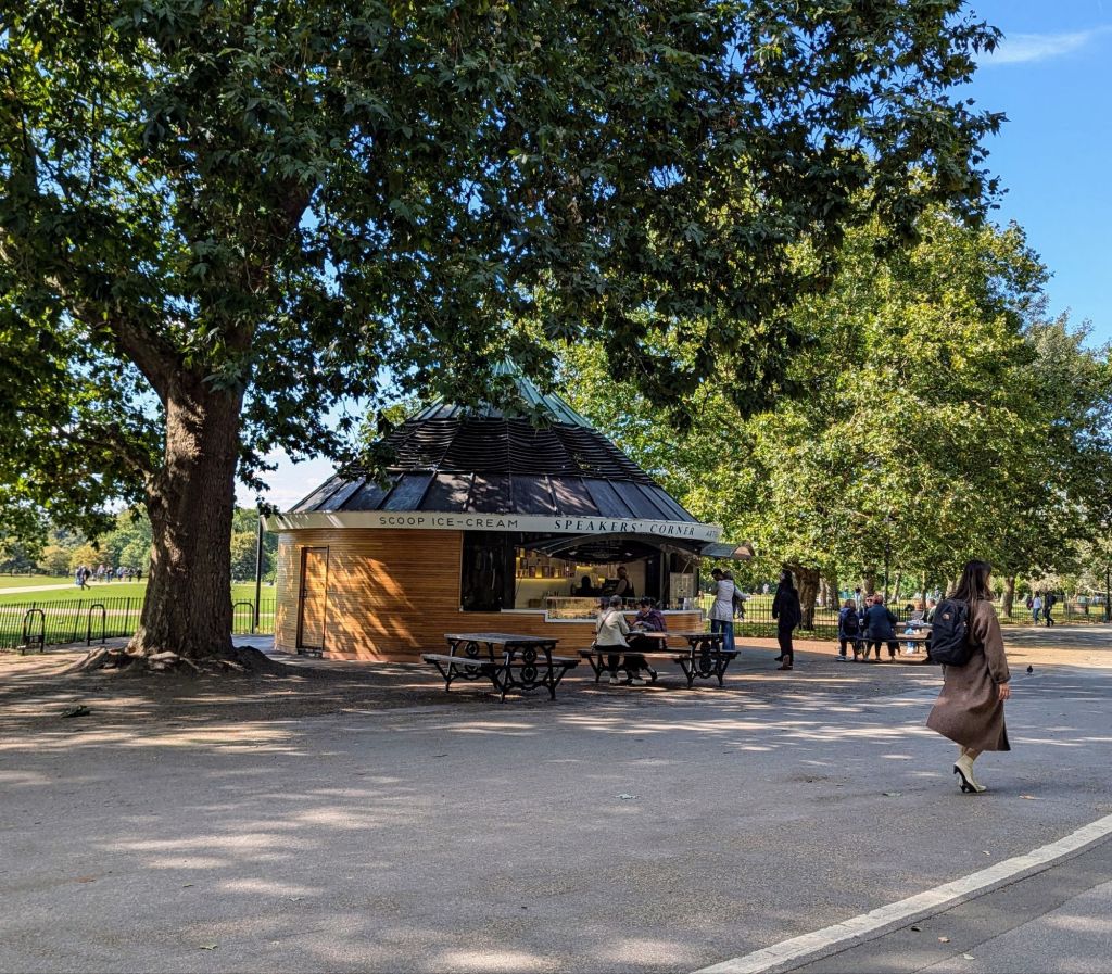 13:30 Uhr: Wir sind unterwegs zu unserem nächsten Ziel, der bekannten Speakers’ Corner. Hier sollen schon George Orwell und Karl Marx versucht haben, die Massen mit ihren Reden zu überzeugen. Auch heute sollen hier noch Reden gehalten werden, wir haben allerdings keinen Redner gesehen. Ich kann mir gut vorstellen, dass dies durch das Aufkommen von Social Communitys massiv gesunken ist.