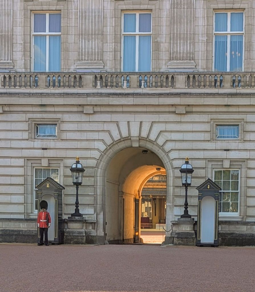Wir sind gerade unterwegs zu unserem letzten geplanten Highlight auf unserer Tour durch London, dem Buckingham Palace. Wir müssen aber erst einmal unsere Voucher in Tickets umtauschen. Schnell noch ein Foto von einem der Wachen, dann suchen wir den Ticketcounter, wo der Umtausch stattfinden soll. Oh, das ging einfach und fix. Und einen gratis Tourguide auf Deutsch haben wir auch gleich erhalten.