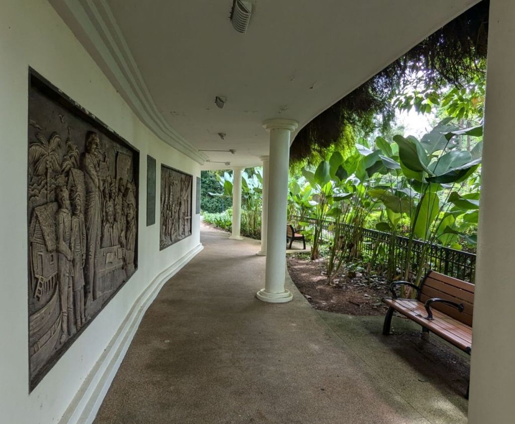 Jetzt geht’s weiter durch den Dschungel. Wir müssen ein paar weitere Treppen hinauf. Das Wasser läuft bei uns in Strömen und das, obwohl wir langsam laufen. Endlich angekommen beim Mount Faber Peak. Der Weg war wirklich kurz, aber auch anstrengend bei der Hitze. Die Sicht dafür ist sehr schön, und hier unten gibt es auch ein paar Bronzetafeln, auf denen die Geschichte von Singapur abgebildet ist.