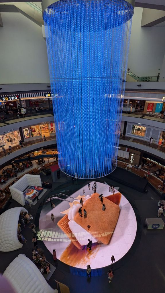 13:15 Uhr: Angekommen beim Marina Bay Sands Shopping-Center. Trotz des langsamen Tempos qualmen die Füße und wir haben richtig Durst. Dann schauen wir mal, wo wir hier etwas zu trinken bekommen. Aber erst einmal werfen wir einen Blick auf diese Videoinstallation. So kann man auch auf einfachem Wege interessante Werbung vermitteln. Das schaut man sich von dieser Perspektive sogar freiwillig an. 😂