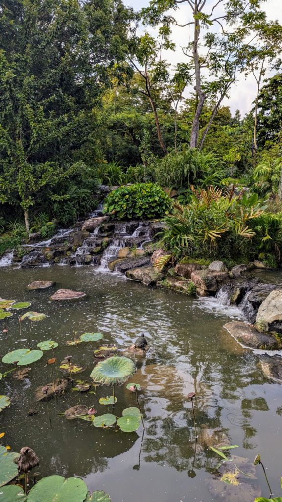 17:30 Uhr: Wir haben uns noch mal auf den Weg gemacht zu den Gardens by the Bay. Der Teil von Singapur ist wirklich schön und gemütlich, aber diesmal wollen wir hier nur eine Kleinigkeit essen gehen und die entspannten Ecken der Parkanlage genießen. Unser Ziel ist es zu chillen wie diese Schildkröte hier, die scheinbar gebannt auf den Wasserfall schaut.