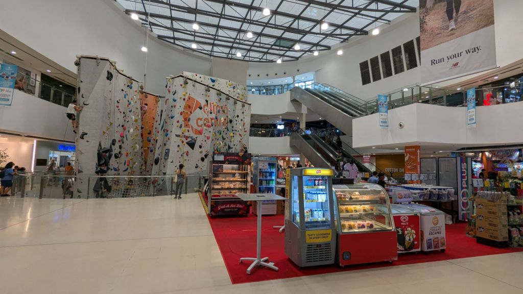 09:30 Uhr: Wir starten heute gemütlich in den Tag und laufen einfach etwas durch die City. Erstes Ziel, das Shopping-Center hier gleich bei uns um die Ecke. Was ich wirklich interessant finde, ist, dass sich die Shopping-Center hier in Asien immer mehr als Ort der Begegnung entwickeln. Es gibt ein Fitnessstudio und mehrere Vereine für Kampfsport. Auch diese große Kletterwand und einen Indoor-Kinderspielplatz haben wir gesehen. Vielleicht eine Idee für die Shopping-Center-Betreiber auch in Deutschland, um diese attraktiver zu machen?