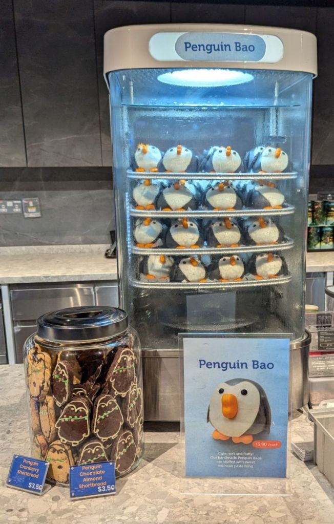 Ich sehe zudem, dass es hier noch in die Tiefe geht und die Pinguine somit auch im Wasser herumtoben könnten. Das Highlight für Kinder scheint aber der Souvenirshop und das Café zu sein. Hier gibt es Unmengen an Souvenirs von Pinguinen und eine große Menge an Essen, welches mit Pinguinen verziert ist.