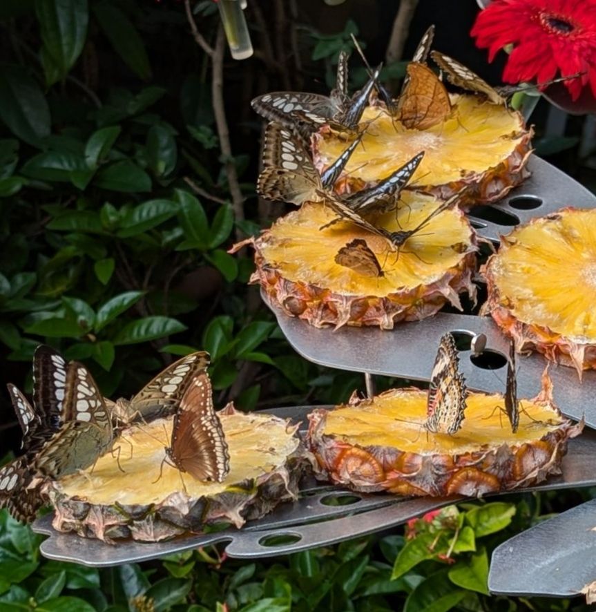 Am Eingang des „Butterfly Garden“ steht auch ein Schild, dass diese meistens Schmetterlinge von 8 bis 17 Uhr aktiv sind. Aber wir haben Glück. Die meisten Schmetterlinge tummeln sich gerade auf den Ananasscheiben, die hier für sie verteilt wurden. Das ist perfekt für Fotos.