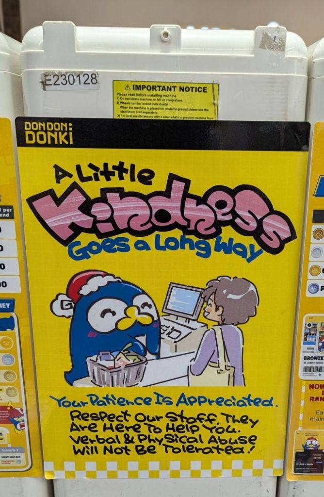 11:00 Uhr: Der Kaffee tat richtig gut. Jetzt schauen wir noch mal bei „Don Don Donki“ nach, ob wir hier vielleicht heute unser Merchandise bekommen. Schade, wieder kein Glück gehabt. Dann gibt es eben nur ein kleines Getränk und schnell noch ein Foto von diesem Hinweis bezüglich des respektvollen Umgangs mit dem Personal.