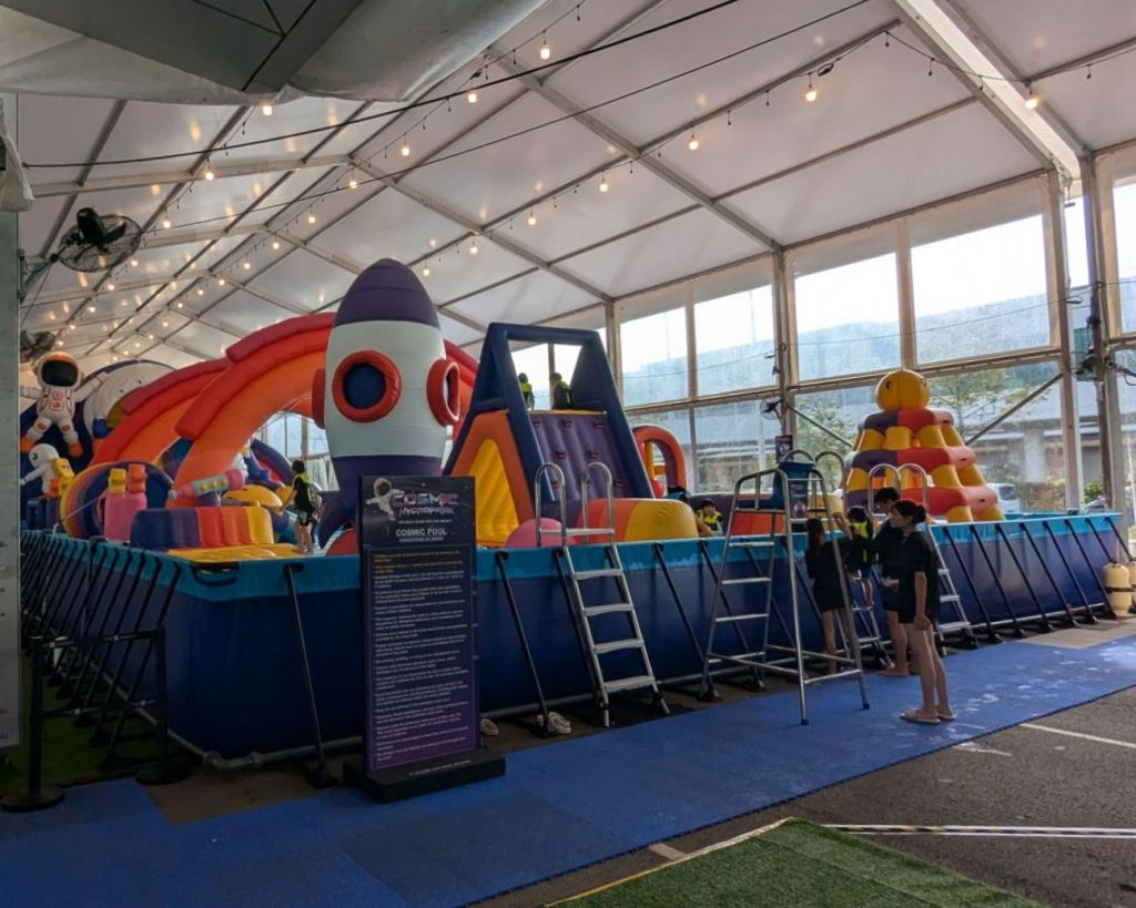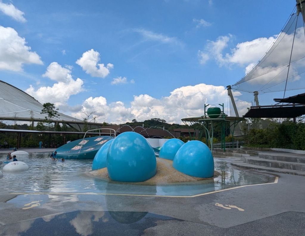 Wir haben es endlich zum Badebereich geschafft. Dies ist eine kleine und überschaubare Anlage, die nur für Kinder gedacht ist. Das Ganze wirkt für mich wie eine Miniaturausgabe von Takeshi Castle. So etwas Ähnliches haben wir vor zwei Wochen schon einmal auf Sentosa gesehen. Ich glaube, wenn ich noch einmal Kind wäre, würde ich hier stundenlang Zeit verbringen.