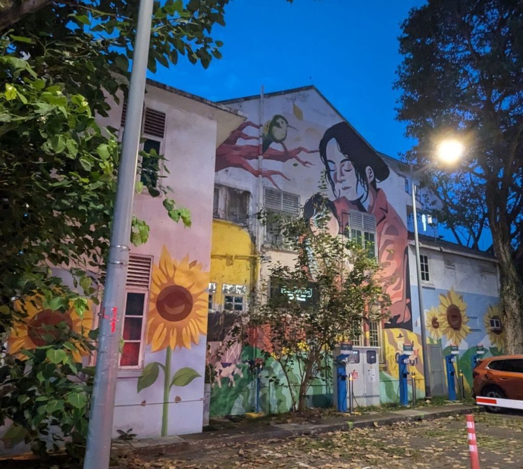 Von einem BNI-Mitglied haben wir erfahren, dass das Viertel, in dem wir unser Hotel haben, zu den ruhigeren und ursprünglicheren Vierteln in Singapur zählt. Was mir hier in diesem auffällt, sind aber die vielen Wand-Graffitis oder Gemälde, die man hier findet. So wie ich es gerade sehe, sind manche sogar am Abend angeleuchtet.