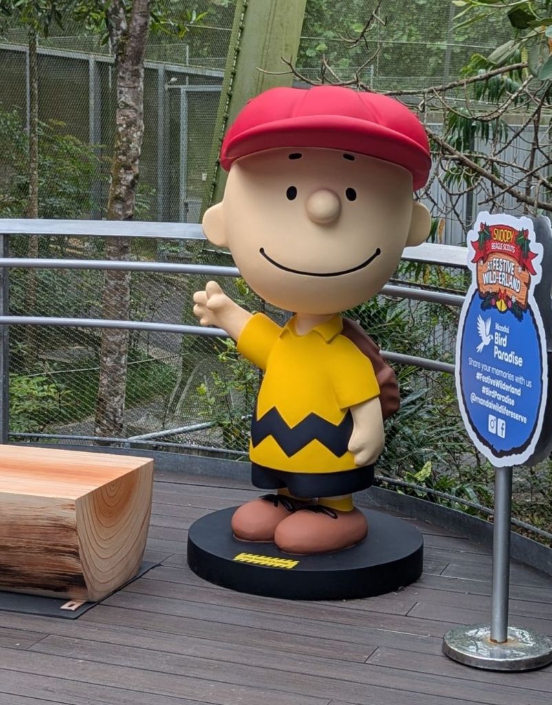 Ich bin beeindruckt, wie lang der Weg ist, bis wir endlich am Eingang angekommen sind. Links und rechts des Weges gab es bereits viele Essensmöglichkeiten. Aber hier sind mir auch gleich die Snoopy-Charaktere aufgefallen, denn es gibt aktuell eine spezielle Aktion mit diesen in dem Vogelpark.