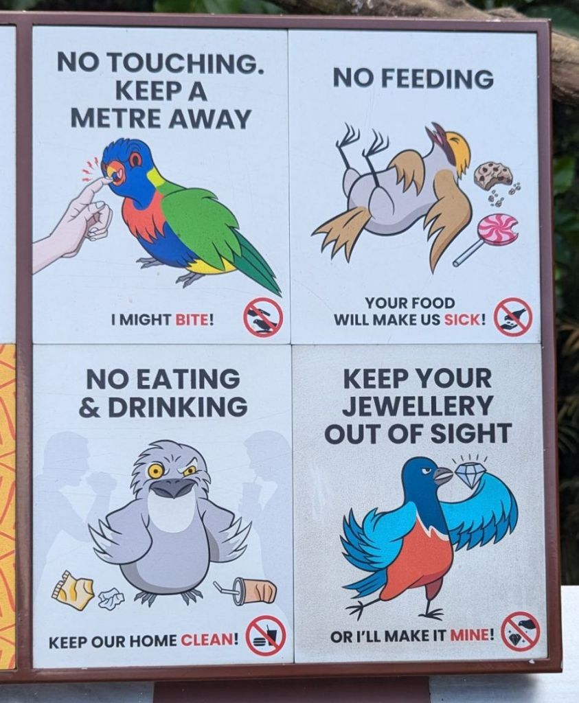 In jeder Anlage gibt es im Übrigen mehrere Hinweisschilder, wie man sich hier verhalten soll. In einer haben wir sogar gesehen, dass man keine Glitzersteine, also Diamanten oder anderen Schmuck, öffentlich tragen soll. In dieser Anlage scheinen Vögel gewesen zu sein, die auf Glitzerzeug stehen und sich dieses gerne schnappen.