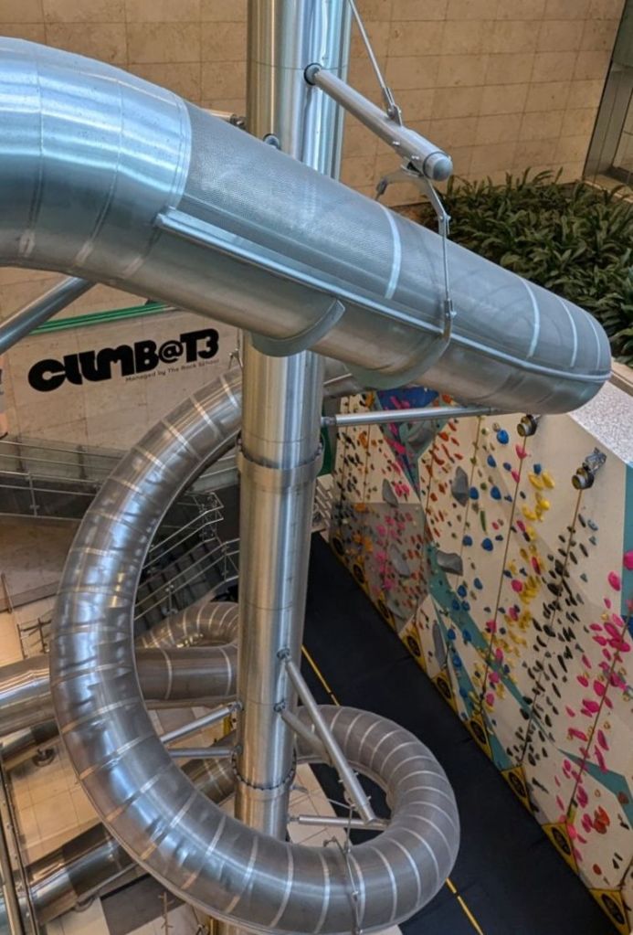 Wir laufen jetzt zu dem Terminal, in dem es einen Badebereich geben soll. Diesen wollen wir uns noch einmal anschauen. Oh, was ist das. Hier gibt es eine Kletterwand und eine große Indoor-Rutsche. Um diese zu nutzen, müssen wir nur die App des „Changi Airports“ herunterladen und Mitglied von diesem werden.