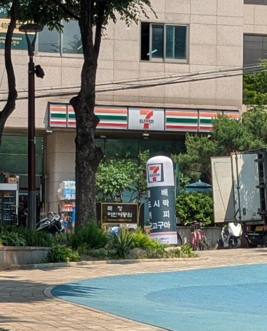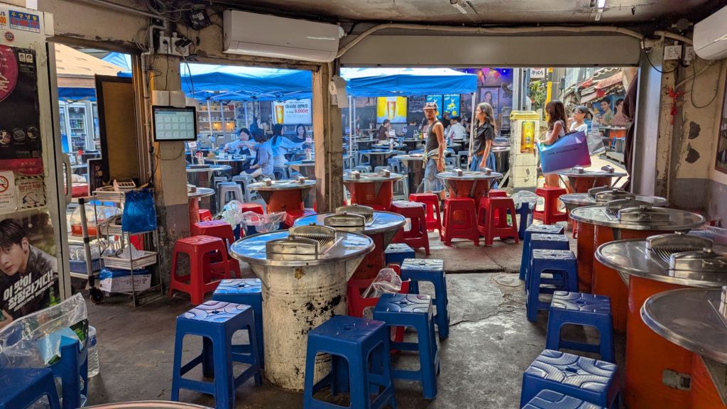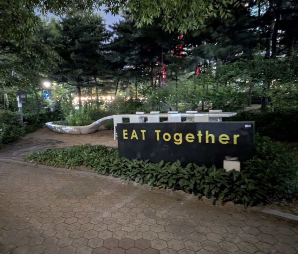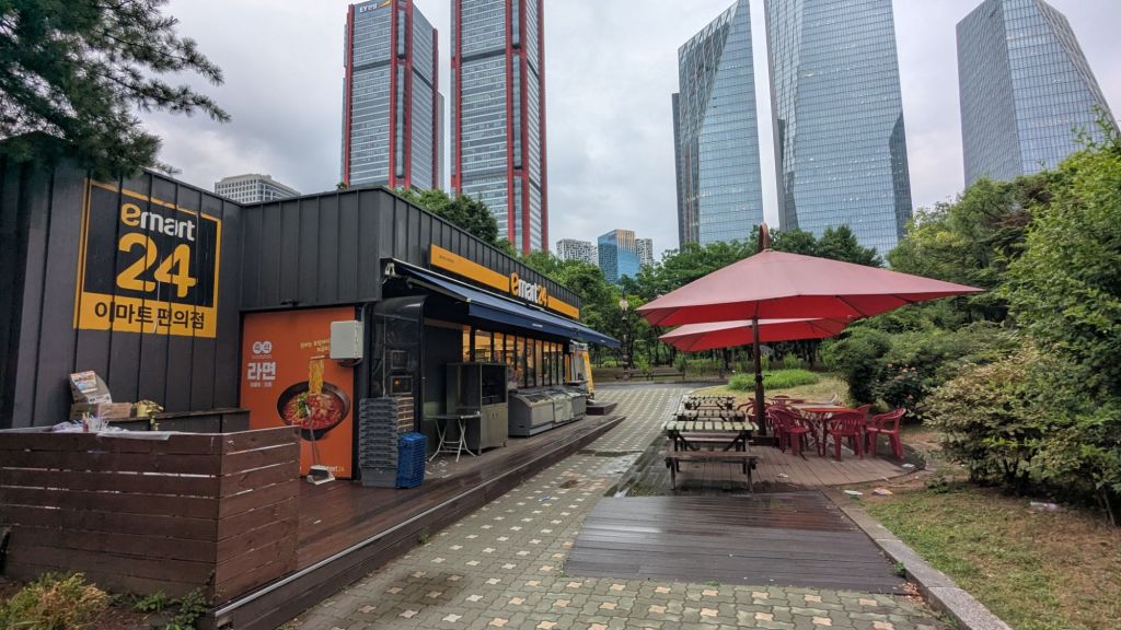 Das wollte ich eigentlich noch erzählen. Eine der Besonderheiten bei den Convenience Stores hier in Südkorea ist, dass es vor diesen meistens eine kleine Sitzmöglichkeit gibt. Diese hier ist besonders gut ausgebaut. Manchmal sind es auch nur zwei bis drei Hocker.