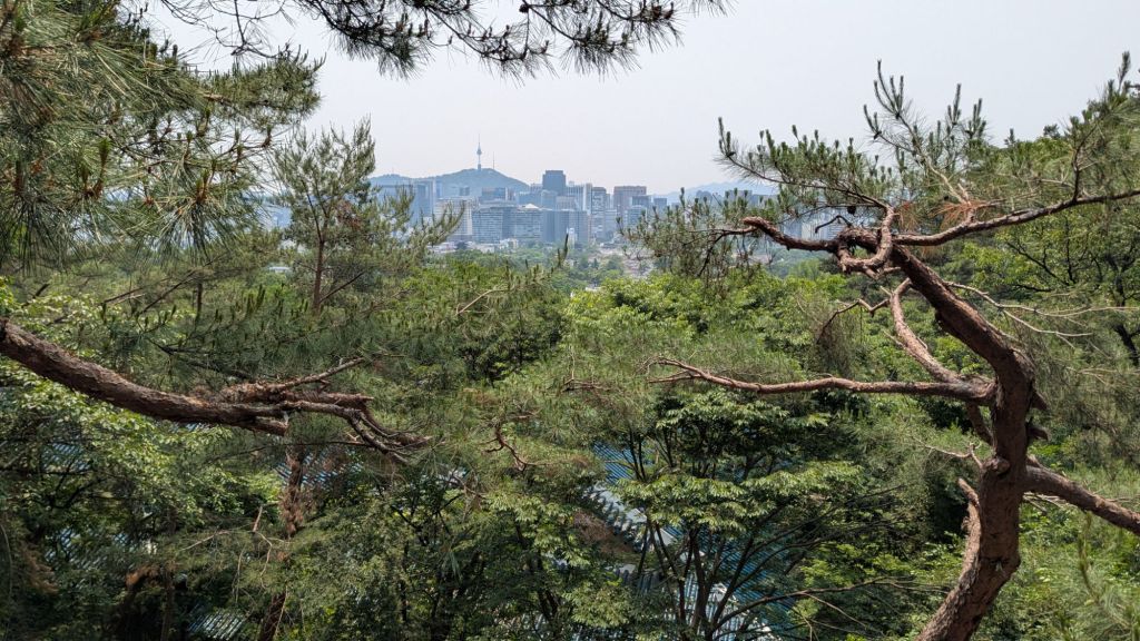 Im Hintergrund sollte man jetzt den Seoul Sky sehen, also das höchste Gebäude, auf dem wir vor zwei Tagen waren. Aktuell ist der obere Bereich aber komplett von Wolken verdeckt.