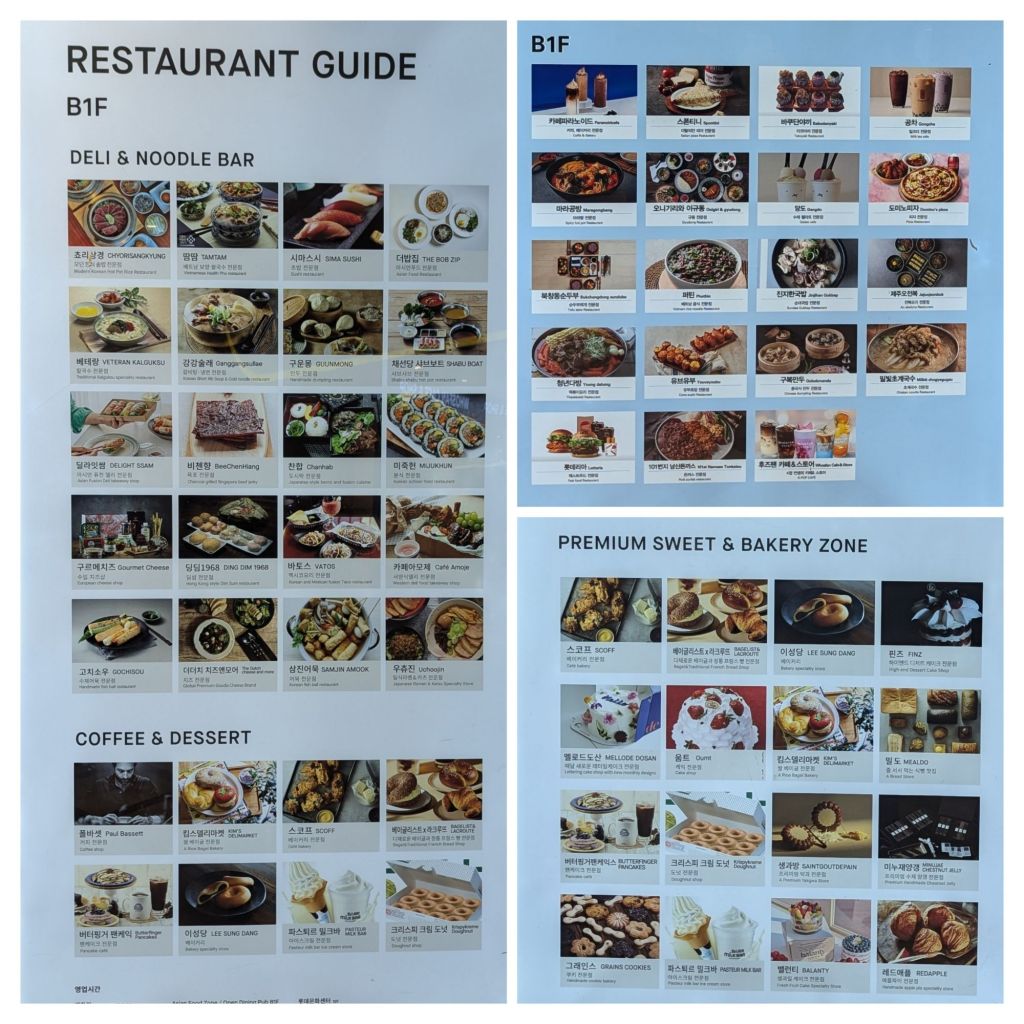 Alleine hier in diesem Bereich gibt es so viele gute gastronomische Angebote, dass man problemlos einen Monat jeden Tag etwas anderes essen könnte. Ich habe mal die Übersichtstafeln der Geschäfte, die sich nur auf dieser Ebene befinden, abfotografiert. Sehr beeindruckend.