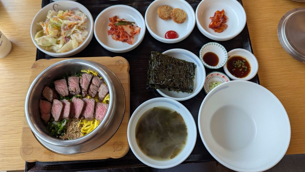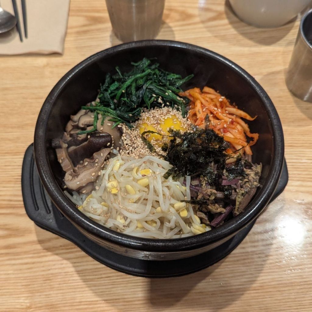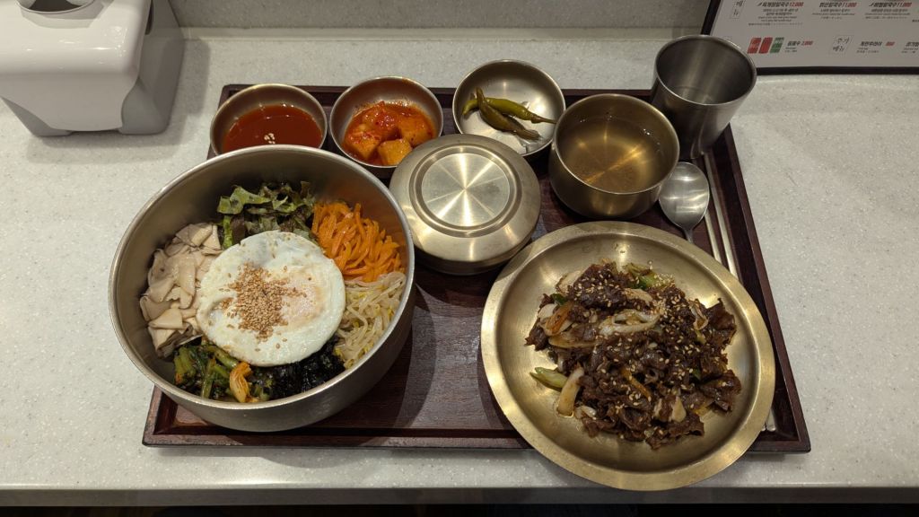 In der Mall, die wir vor drei Tagen entdeckt haben, gab es ja genügend Essensangebote. Da schauen wir jetzt mal, was wir dort Leckeres finden. Ah, super, heute gibt es Bibimbab. Das ist perfekt für die letzten Tage hier in Südkorea.