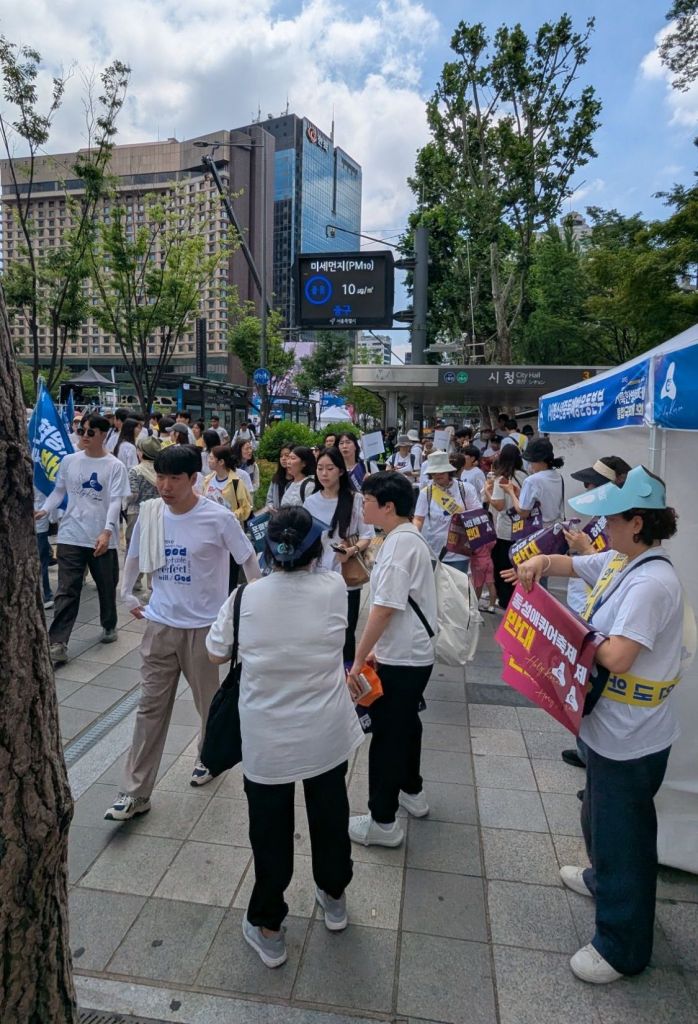 Wo bin ich hier hinein geraten? Laute Musik, lauter Mensch mit Einheitskleidung. Und ich sehe ein Schild auf Englisch „Kings Army“. Hmmm, ist das eine Sekte? Wenn ja, wäre die Anhängerschaft riesig. Die haben hier zwei große Leinwände mitten in Seoul aufgebaut.