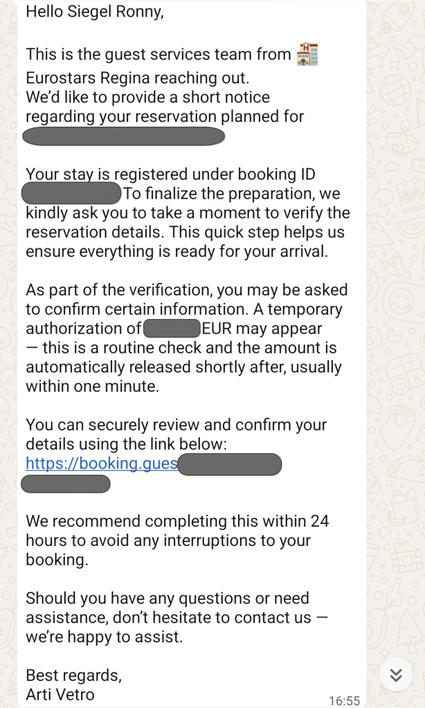 - Du erhältst eine Nachricht über WhatsApp mit Daten einer tatsächlichen Buchung.