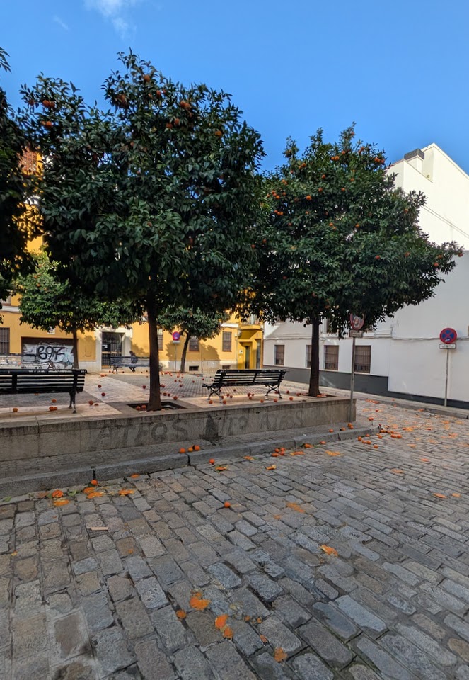 Ich bin gerade unter einer der Orangenbaum-Alleen hindurchgelaufen. Wahrscheinlich durch den Regen hat das ganz schön nach frischer Orange geduftet. War sehr angenehm.