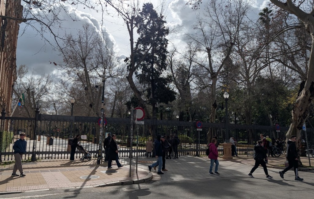 Da das Wetter wirklich gerade gut mitspielt, gehe ich jetzt zu meinem nächsten Ziel, dem „Plaza de Espanya“. Das sind nur knapp 20 Minuten zu Fuß bis dorthin. Oh, ich laufe gerade an einer Parkanlage vorbei, die sich vor dem Plaza de Espanya befindet. Und dieser Park ist aufgrund der aktuellen Wettersituation abgeschlossen. Ich ahne Schlimmes.