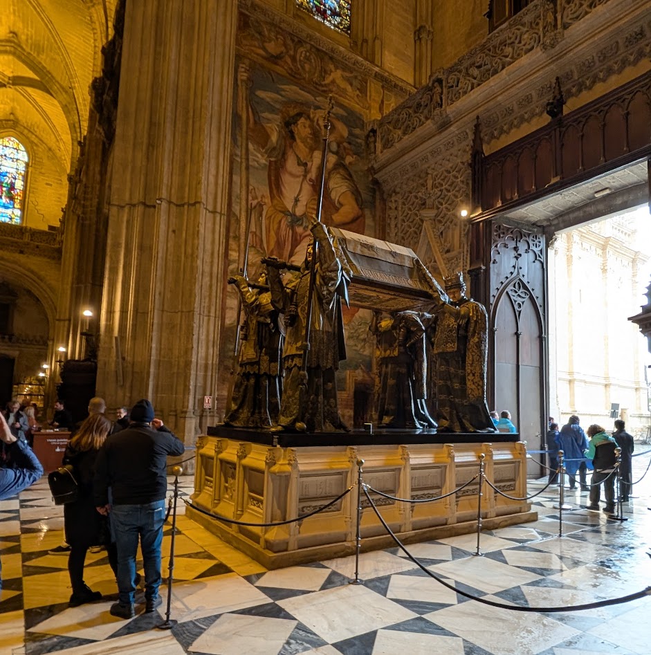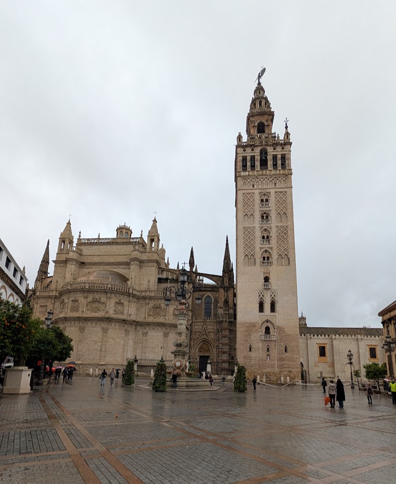 Jetzt fängt es auch gerade an, heftiger zu regnen. Oh man, meine Hosen sind unten schon komplett durchnässt. Hoffentlich geht‘s gleich in die Kathedrale von Sevilla. Sie soll eigentlich in 15 Minuten öffnen.