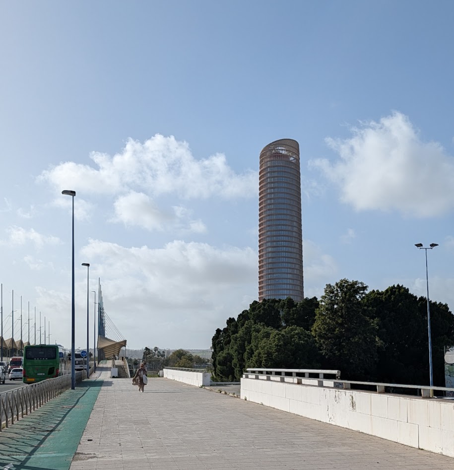 16:00 Uhr: Auf der Fahrt nach Italica ist mir erneut der große Turm aufgefallen. Da wir hinzu an dem vorbeigefahren sind, habe ich auch einige Menschen dort gesehen. Deswegen habe ich mal schnell gecheckt, was das für ein Teil ist. Und siehe da, auf dem Torre Sevilla gibt es eine Aussichtsplattform. Ich habe gerade mein nächstes Ziel für heute gefunden.