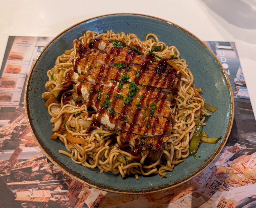 Oh, ich habe gerade ein Restaurant mit asiatischer Küche entdeckt. Hier gibt es Yakisoba. Und das scheint auch eine Kette zu sein. Sie heißt „Udon“ und kommt ursprünglich aus Barcelona. Na dann, werde ich das mal probieren. Aber aktuell ist hier auch nicht sehr viel los. Entweder ist es noch zu zeitig oder dies ist typisch für einen Wochentag.
